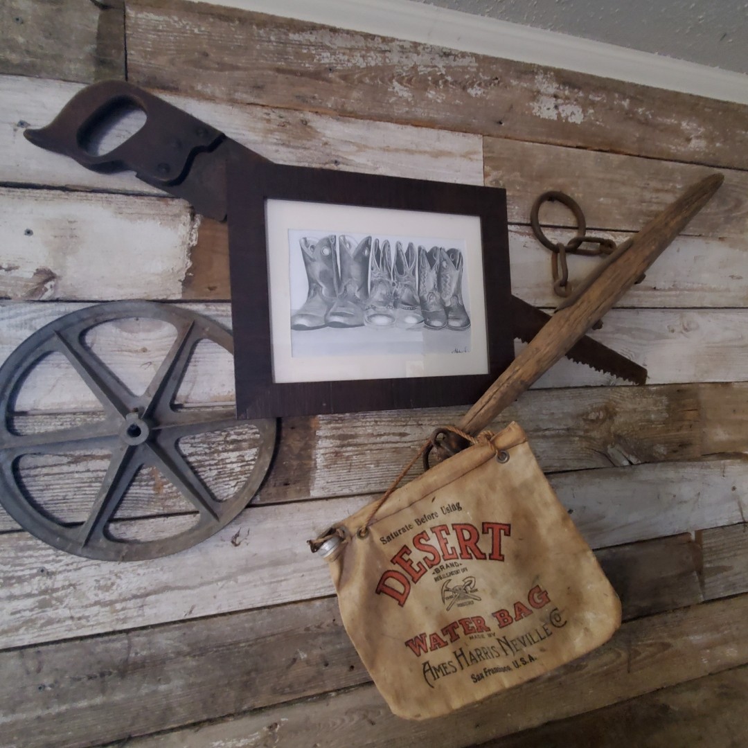 A stylish arrangement of thrifted decor items. This arrangement was $15.00. The bag and picture (which is a sketch of mine and my girls boots)were given to me and the other 3 items were $5 each. You can make a very cute grouping and then throw in one of your favorite pictures to top it off.